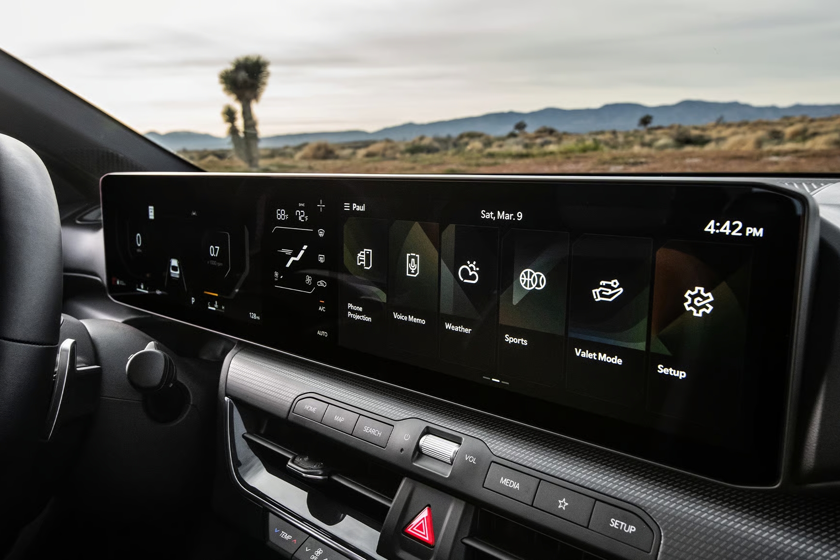 De Kia K4 zet niet alleen nieuwe normen in het C-segment met een royaal interieur, maar ook door de geavanceerde technologie. Centraal staat een panoramisch display met een 12,3-inch digitaal instrumentenpaneel, een 5,3-inch bedieningsscherm voor de klimaatregeling en een 12,3-inch infotainmentscherm. De Connected Car Navigation Cockpit integreert navigatie, multimedia en voertuiginstellingen in één gebruiksvriendelijke interface. Draadloze Apple CarPlay® en Android Auto™ zijn standaard; hogere uitvoeringen krijgen bovendien een draadloze telefoonoplader.