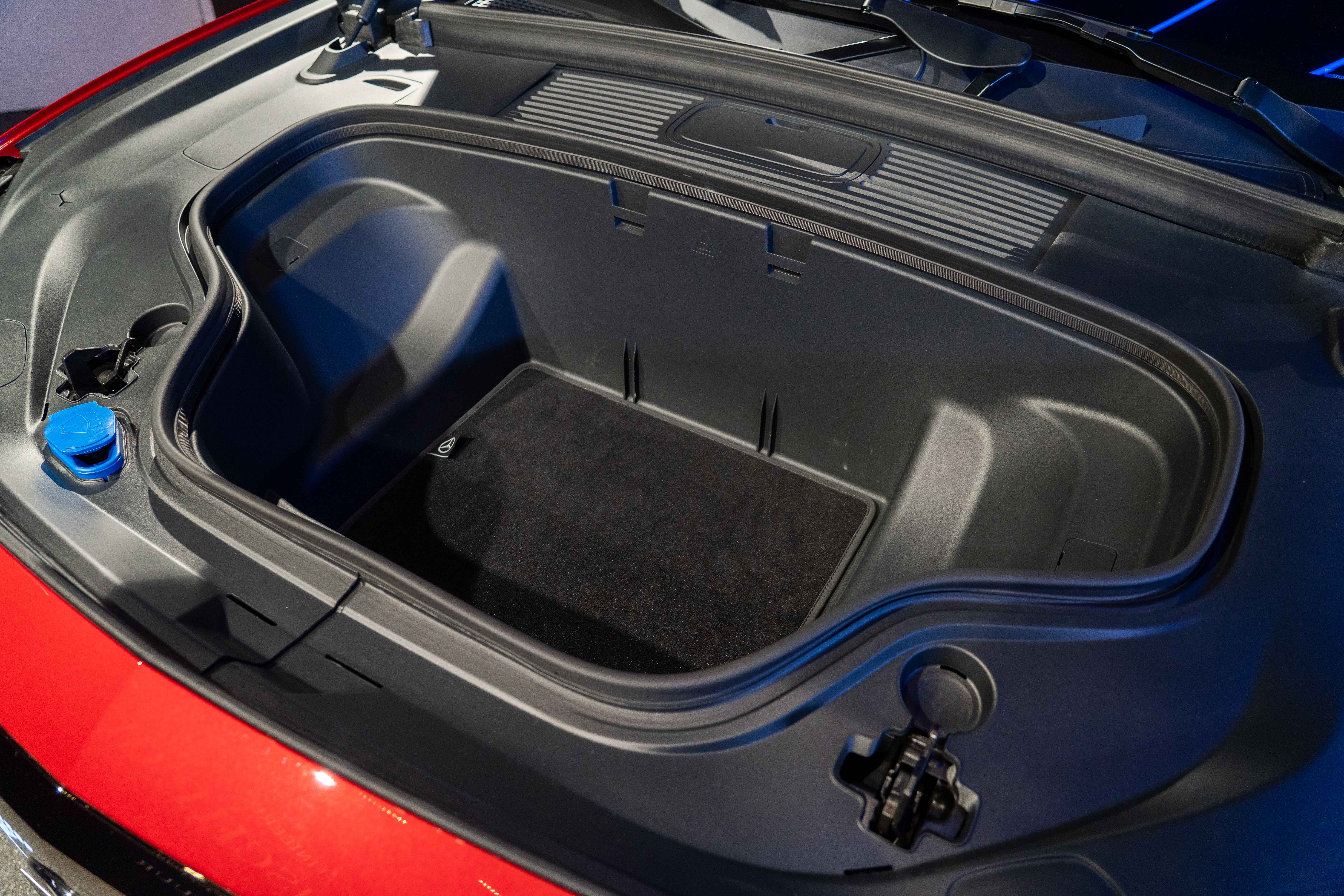 Een praktische toevoeging aan de voorkant is de ruime frunk. Deze bagageruimte onder de motorkap biedt maar liefst 128 liter extra opbergruimte en opent eenvoudig door op het Mercedes-logo te drukken, in plaats van een knop verborgen in het interieur of infotainmentsysteem.